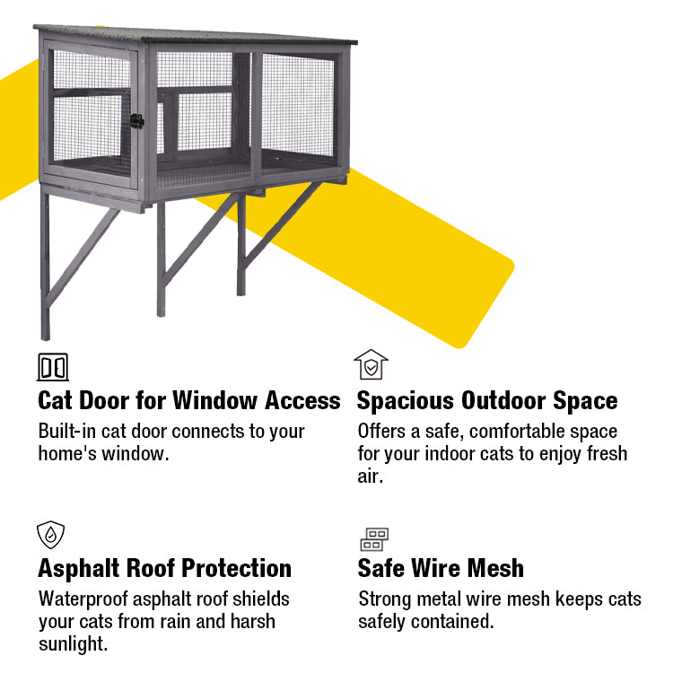 - 【Window Cat Kennel】: A removable back door allows you to connect the cat cage to the window. Allows cats to enjoy the free air while ensuring safe entry and exit.【Play Cat House】: Large wooden cat playpen provides cats or kittens with a fun, safe place to hang out or play. Spacious and separate space for 1-2 cats and other small pets.【Sturdy & Safety】: The upgraded version of Cat Run adds the surrounding reinforcement wooden strip structure to the product to make it more robust and durable. A waterproof asphalt roof is perfect for outdoor use.【Safety You Can Trust】: Designed with a safety net, this cat enclosure keeps your pets protected from outside dangers, such as vehicles, predators, so you can relax knowing they're safe.【Catio Information】: Overall dimensions: 39.9"L x 22.8"W x 43.3"H (162L x 50W x 154H cm). Assembly required. NOTE: Installation requires a 17.7" height space under the bottom.