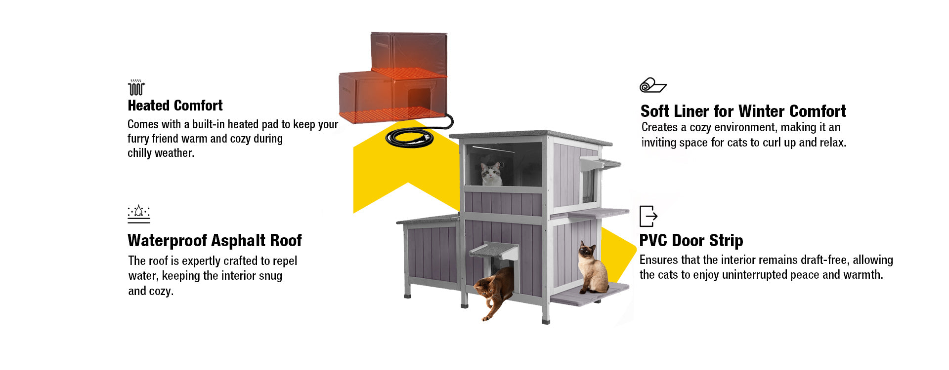 Give your outdoor cats a cozy and secure retreat with this 2-Storey Wooden Heated Cat House. Designed for comfort and durability, it features a 6-sided insulated liner and a heating pad to keep your pets warm through winter nights. The dual-level layout provides multiple cats with separate areas for rest and play, while PVC door flaps and a weatherproof asphalt roof shield them from rain, snow, and cold drafts. Raised legs improve air circulation and keep the interior dry.