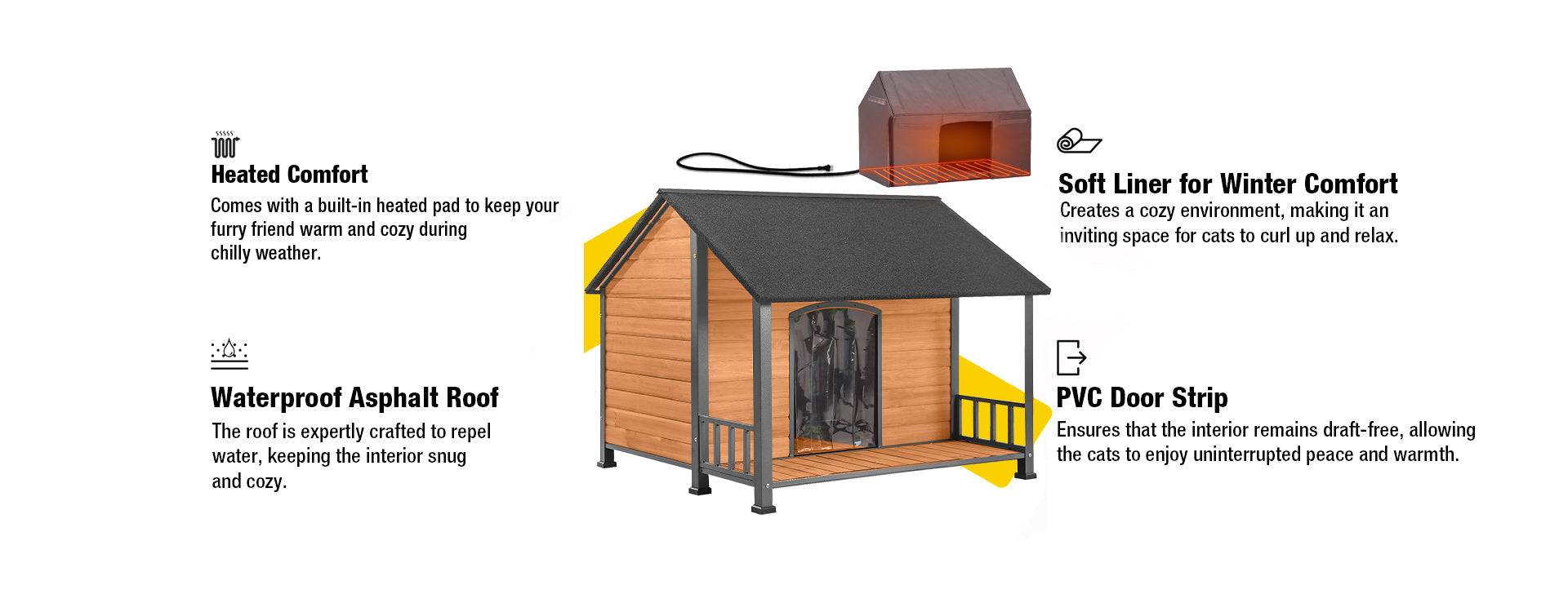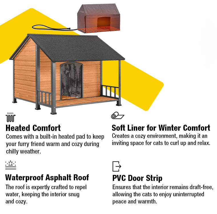 All-weather wooden dog house designed for comfort and durability. Features a strong metal frame, safe heating system, removable insulation liner, and an extended porch for lounging — keeping your dog warm, dry, and relaxed year-round.
