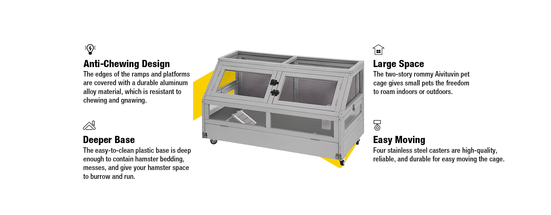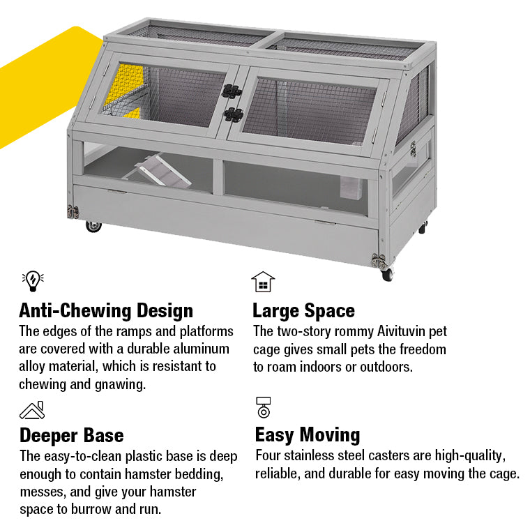Our hamster cage adopts anti-chewing design, which solves the shortcomings of other hamster cages on the market. Buying 2 or more cages to a larger space. 4 strong metal wheels for easy movement indoors and outdoors.