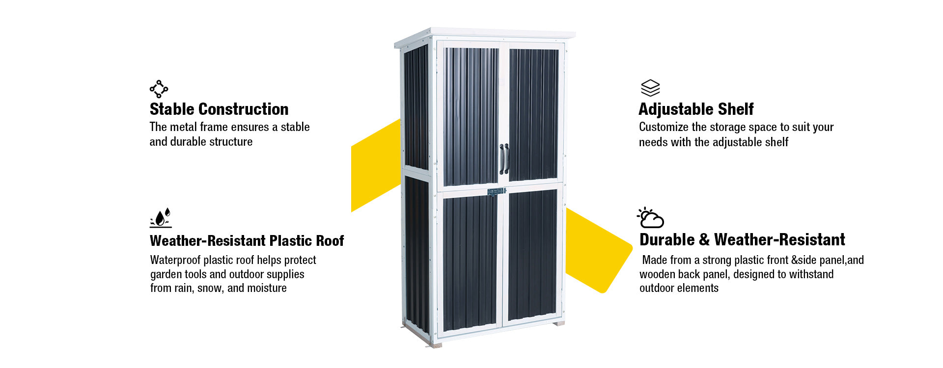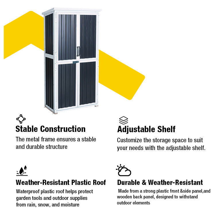 Outdoor storage shed with sturdy iron frame, premium fir wood, and waterproof roof for year-round protection. Spacious interior with adjustable shelves keeps garden tools, equipment, and outdoor supplies organized—perfect for backyard, patio, or garden use.