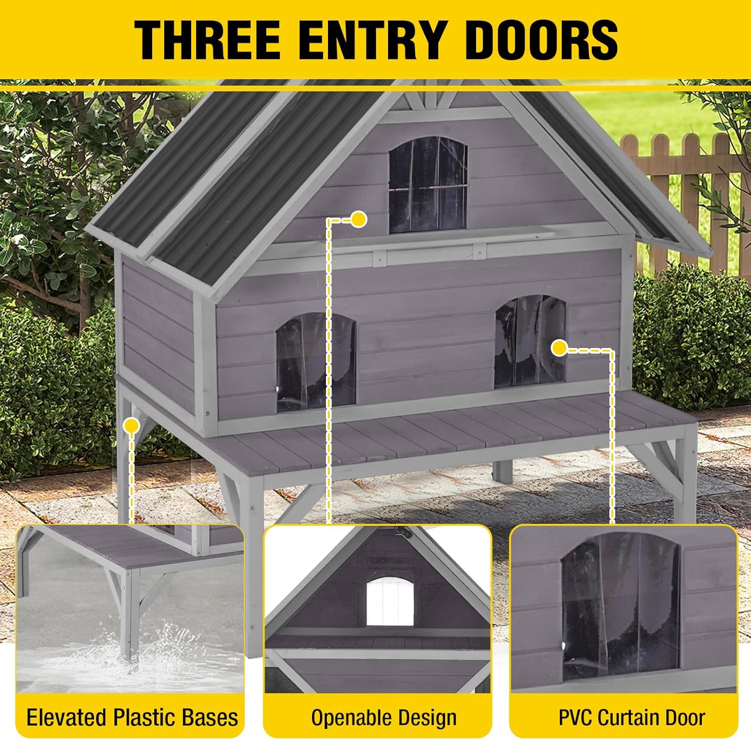 - IDEAL FOR OUTDOOR CATS: This outdoor cat house comes with three secure escape doors, letting stray and feral cats come and go freely while supporting their need for safety and independence. Designed as a practical shelter solution for outdoor felines, its weatherproof build provides a warm, dry haven in harsh environments. The 2-story cat shelter design and predator-deterring door size work together to enhance safety inside.